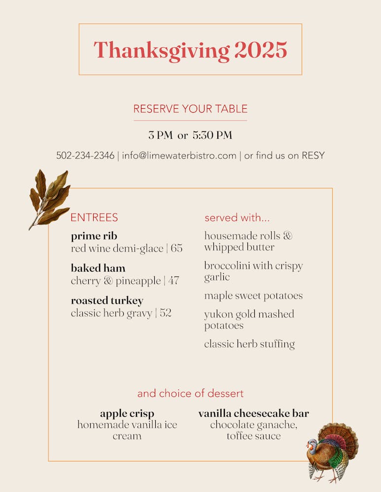 For reservations, call us at 502-234-2346 email info@limewaterbistro.com or find us on RESY!